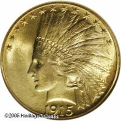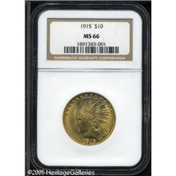 <B>1915 $10 MS66 NGC.</B></I> NGC has certified just nine examples of this date in MS66 grade, and two others in MS67 grade, and the present sale includes an example in each of those two grades. Although considered a common date issue, and not a rarity in any grade, Premium and Superb Gem examples are few and far between. This one has rich and frosty yellow-gold color with a hint of green. Just a couple miniscule abrasions keep this from the Superb Gem classification. It is sharply struck and highly attractive. Lot:8885