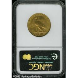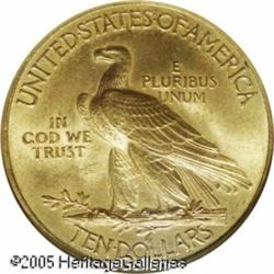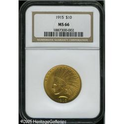 <B>1915 $10 MS66 NGC.</B></I> The 1915 is one of the more frequently encountered P-mints in the series and it is similar in scarcity to the 1910, 1912, and 1913. The overall appearance of this coin is breathtaking. All the factors that go into making up the grade and value of any coin are present here. The mint luster is frosted and shines brightly over each side. The luster is fully intact and each side has lovely honey-gold patina interspersed. Fully struck also, the surfaces show no obvious abrasions, although a couple are present on the Indian's cheek and neck. All in all, the coin has strong visual appeal as well as technical merit and we expect it to bring a strong price at auction. Population: 9 in 66, 2 finer (1/05). Lot:8886