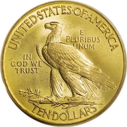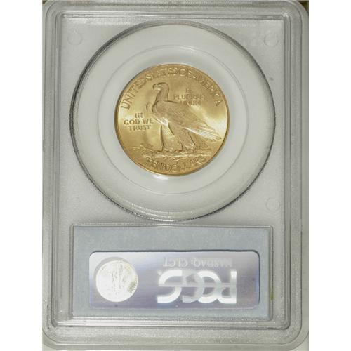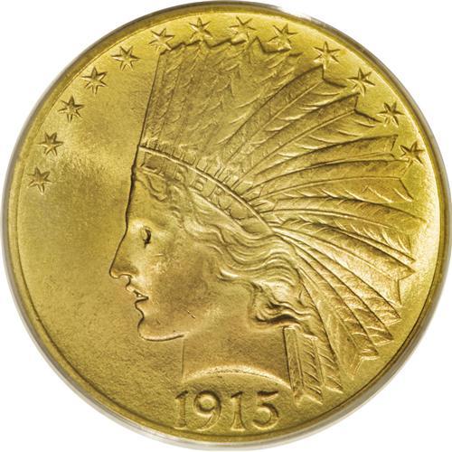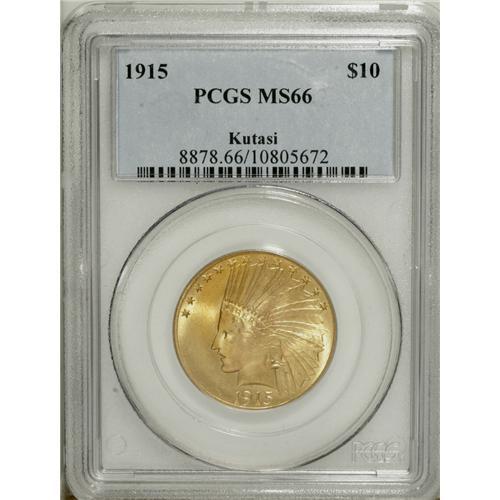 <B>1915 $10 MS66 PCGS.</B></I> The 1915 is among the more available issues in the ten dollar Indian series in Uncirculated grades. Among P-mint dates, it is much scarcer than the 1932 and 1926, and it is also scarcer than the 1907 No Periods, 1908 With Motto, and 1911. When considered as a type coin, the 1915 presents the collector with new challenges. Because it has granular surfaces, as do all tens struck from 1908 through 1916, eye appeal can be a problem because of the dispersive effect of the matte-like finish. However, this piece is notable for its bright mint frost that overpowers the pronounced granularity seen over both obverse and reverse. Sharply struck in most areas, the only trace of softness is on the fore part of the eagle's wing. The coin has distinctive color with an interplay of orange-gold, yellow-gold, and lilac over each side. Despite its common status in lower grades, the 1915 is seldom offered in MS66 condition with only 22 other pieces graded as such by both PCGS and NGC combined, and five finer (11/06).<BR><I>From The Kutasi Collection.</B></I><BR><BR><b>Shipping:</b> Coin/Currency (<a target="_blank" href="http://www.heritageauctions.com/common/shipping.php">view shipping information</a>)
