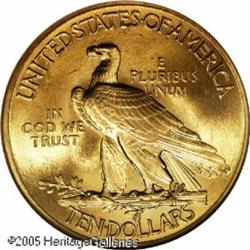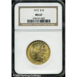 <B>1915 $10 MS67 NGC.</B></I> Brilliant and frosty luster with extremely sharp design definition. This example is tied for the finest certified by either grading service. Regarding this issue, gold authority David Akers noted: "True gems are rare but are seen more often than all but a handful of the series' 32 issues. In addition to the MS65 quality coins, there are also a small number of superb MS67 quality specimens known, including several nearly perfect ones." We believe that this example must be one of those nearly perfect coins that Akers described. Population: 2 in 67, 0 finer (1/05). Lot:8887