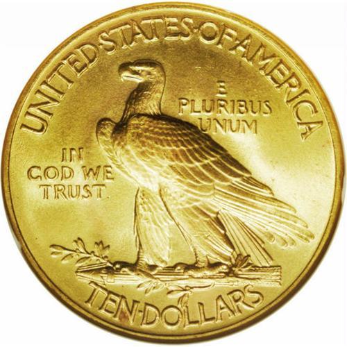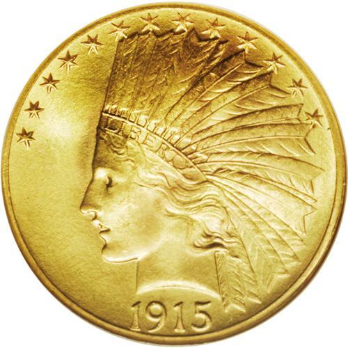 <B>1915<$10> MS67 NGC.</B></I> This is one of the plentiful dates in the series, from a mintage of 351,000 coins, and yet it is virtually impossible to locate in Gem quality. Noted gold coinage authority David Akers commented about this issue: "True gems are rare but are seen more often than all but a handful of the series' 32 issues. In addition to the MS65 quality coins, there are also a small number of superb MS67 quality specimens known, including several nearly perfect ones." While we are not certain that Mr. Akers actually saw this particular coin, it certainly qualifies as a nearly perfect example. Both sides have fully brilliant yellow-gold luster with frosty surfaces. Hints of pinkish toning complement the color of this Superb Gem. The reverse has a few tiny copper toning spots, but these are hidden in the design work, and not readily apparent. No finer examples of this date have been certified, and in fact, this is only the third Superb Gem example that has appeared in any of our auctions since 1993.