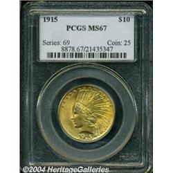 <table><tbody><tr><td><table> <TR><TD width="100%"><TABLE cellSpacing=1 cellPadding=3 width="100%" border=0><TBODY><TR><TD width="100%" bgColor=#79735c><FONT face=arial color=#ffffff size=3><B>Description</B> </FONT></TD></TR><TR><TD width="100%" bgColor=#ffffff><FONT face=arial size=2><B>1915 $10 MS67 PCGS.</B></I> The 1915 is one of the more frequently encountered P-mints in the series and it is similar in scarcity to the 1910, 1912, and 1913. While other Superb coins are alleged to exist, to date (10/03) only one has actually been certified and that is an NGC piece. The overall appearance of this coin is breathtaking. All the factors that go into making up the grade and value of any coin are present here. The mint luster is frosted and sparkles brightly over each side. The luster is fully intact and each side has lovely lilac and golden-rose patina interspersed. Fully struck also, the surfaces show no obvious abrasions. All in all, the coin has strong visual appeal as well as technical merit and we expect it to bring a strong price at auction. </FONT></TD></TR></TBODY></TABLE></TD></TR></TBODY></TABLE><BR><A name=PricesRealized></A><TABLE cellSpacing=0 cellPadding=0 width="100%" bgColor=#000000 border=0><TBODY><TR><TD width="100%"><TABLE cellSpacing=1 cellPadding=3 width="100%" border=0><TBODY><TR><TD width="100%" bgColor=#79735c><A name=PR><FONT face=arial color=#ffffff size=3><B>Previous Prices from Heritage Auctions</B> </FONT></A></TD></TR><TR><TD bgColor=#f6f6ed>No Prior Data Recorded </TD></TR><TR><TD bgColor=#ffffff><FONT face=arial size=1 ?>PLEASE NOTE: All prices realized reflect the final hammer price PLUS the buyer's premium in auctions that charge a buyer's premium. Each item has a notation at the top of the listing indicating whether that lot included a buyer's premium. Example: A item that sells with a final hammer price of $100 and a 20% buyer's premium will display with a price realized of $120. All information listed is intended to be as accurate as possible, but errors are possible. Please use this guide carefully and inform us of any inaccuracies. </FONT></TD></TR></TBODY></TABLE></TD></TR></TBODY></TABLE><BR><TABLE cellSpacing=0 cellPadding=0 width="100%" bgColor=#000000 border=0><TBODY><TR><TD width="100%"><TABLE cellSpacing=1 cellPadding=3 width="100%" border=0><TBODY><TR><TD width="100%" bgColor=#79735c colSpan=6><FONT face=arial color=#ffffff size=3><B>Price Guide*</B> </FONT></TD></TR><TR bgColor=#f6f6ed><TD align=middle><B>Grade</B> </TD><TD align=middle><B>Coin World<BR>(Trends)</B> </TD><TD align=middle><B>Numismedia<BR>Retail</B> </TD><TD align=middle><B>Numismedia<BR>Wholesale</B> </TD><TD align=middle><B>Coin<BR>Universe</B> </TD><TD align=middle><B>Heritage<BR>Value Index</B> </TD></TR><TR bgColor=#ffffff><TD align=middle>66</TD><TD align=right>---</TD><TD align=right>---</TD><TD align=right>$7,000.00</TD><TD align=right>---</TD><TD align=right>$11,304.00</TD></TR><TR style="FONT-WEIGHT: bold" bgColor=#cccfdd><TD align=middle>67</TD><TD align=right>---</TD><TD align=right>---</TD><TD align=right>---</TD><TD align=right>---</TD><TD align=right>$18,450.00</TD></TR><TR bgColor=#ffffff><TD align=middle>68</TD><TD align=right>---</TD><TD align=right>---</TD><TD align=right>---</TD><TD align=right>---</TD><TD align=right>---</TD></TR><TR bgColor=#ffffff><TD colSpan=6><FONT size=1>*All information listed is intended to be as accurate as possible, but errors are possible. No item may be returned or refused based on this information which is provided as a service to our customers. You should contact each pricing source directly to determine the accuracy of this information. </FONT></TD></TR></TBODY></TABLE></TD></TR></TBODY></TABLE><BR><TABLE cellSpacing=0 cellPadding=0 width="100%" bgColor=#000000 border=0><TBODY><TR><TD width="100%"><TABLE cellSpacing=1 cellPadding=3 width="100%" border=0><TBODY><TR><TD width="100%" bgColor=#79735c><FONT face=arial color=#ffffff size=3><B>Population Guide</B> </FONT></TD></TR><TR bgColor=#ffffff><TD align=middle><!-- Begin Output of Population Grid--><TABLE cellSpacing=0 cellPadding=0 width="100%" border=0><TBODY><TR><TD vAlign=center><TABLE cellSpacing=0 width="100%" border=1 cellsadding="3"><TBODY><TR><TD vAlign=center><TABLE cellSpacing=0 cellPadding=3 width="100%" border=1><TBODY><TR><TD vAlign=center align=middle bgColor=#f0f1e8 colSpan=2 <CENTER><FONT face=Arial size=2><B>PCGS Pop </B></FONT><CENTER></CENTER></TD><TD vAlign=center align=middle bgColor=#f0f1e8 colSpan=2><CENTER><FONT face=Arial size=2><B>NGC Pop</B></CENTER></FONT></TD></TR><TR><TD vAlign=center><FONT face=Arial size=2>(67)</FONT> </TD><TD vAlign=center align=right><FONT face=Arial size=2>0</FONT> </TD><TD vAlign=center><FONT face=Arial size=2>(67)</FONT> </TD><TD vAlign=center align=right><FONT face=Arial size=2>1</FONT> </TD></TR><TR><TD vAlign=center><FONT face=Arial size=2>(>67)</FONT> </TD><TD vAlign=center align=right><FONT face=Arial size=2>0</FONT> </TD><TD vAlign=center><FONT face=Arial size=2>(>67)</FONT> </TD><TD vAlign=center align=right><FONT face=Arial size=2>0</FONT> </TD></TR></TBODY></TABLE></TD></TR></TBODY></TABLE></TD></TR></TBODY></TABLE><!-- End Output of Population Grid--></TD></TR></TBODY></TABLE></TD></TR></TBODY></TABLE><BR><TABLE cellSpacing=0 cellPadding=0 width="100%" bgColor=#000000 border=0><TBODY><TR> <font color='#000000'><span style='background-color: #FFFFFF'><td bgcolor='#FFFFFE'> Important notice: Heritage usually auctions material at the rate of 200-250 lots per hour. On some occasions eBay Live bid software or the Internet may not be able to keep up with the pace of the auction. We recommend placing a realistic absentee bid now as insurance to avoid disappointment. Occasionally the auctioneer may eliminate or reject an eBay Live bid, and the auctioneer may also reopen a lot after the close of the eBay live bidding (usually because we missed an audience bid), and may reject your bid even if it shows you as the winning