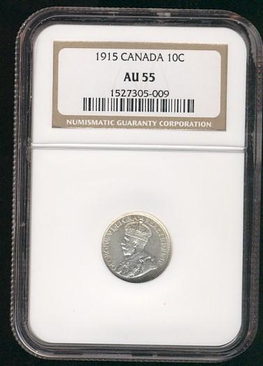 1915 10¢ NGC AU55. Brilliant and appealing.
