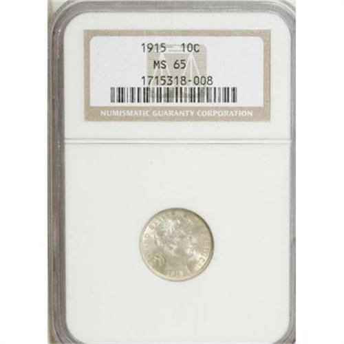 <B>1915 10C MS65 NGC.</B></I> Powder-blue and sun-gold endow this lustrous and assertively struck Gem. Both sides exhibit minimal contact. Scarcer than its 1914 predecessor. Census: 33 in 65, 7 finer (1/08).<BR><I>Ex: FUN Signature (1/04), lot 5691.</B></I><BR><I>From The Southwest Collection.</B></I><BR><BR><B>Coin Engraver:</B> Charles E. Barber<BR><BR><b>Shipping:</b> Coins & Currency (<a target="_blank" href="http://www.heritageauctions.com/common/shipping.php">view shipping information</a>)