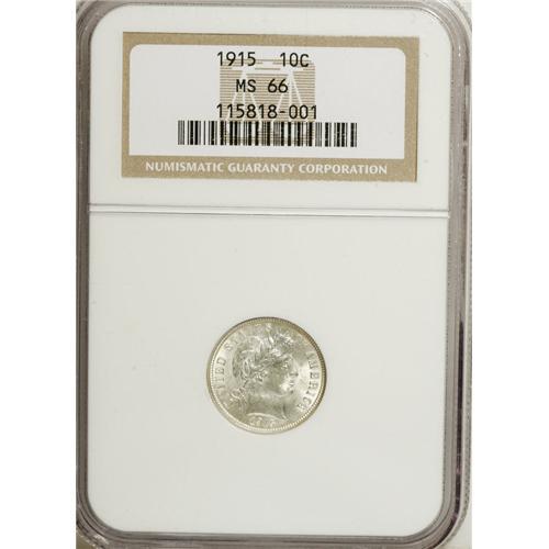 <B>1915 10C MS66 NGC.</B></I> Shimmering mint frost covers each side of this mostly white Premium Gem, which also reveals a few hints of pale gold color on each side. Superficial luster grazes on the obverse are too faint to limit the grade. Conditionally scarce at this grade level, with none finer at either service (4/07).<BR><BR><b>Shipping:</b> Coins & Currency (<a target="_blank" href="http://www.heritageauctions.com/common/shipping.php">view shipping information</a>)