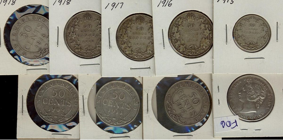 1915,1916, 1917 25¢ and 1918 50¢, Nfld 1918c, 1917c, 1911, 1909, 1874 50¢ pcs. Coins all circulated. Should be viewed!