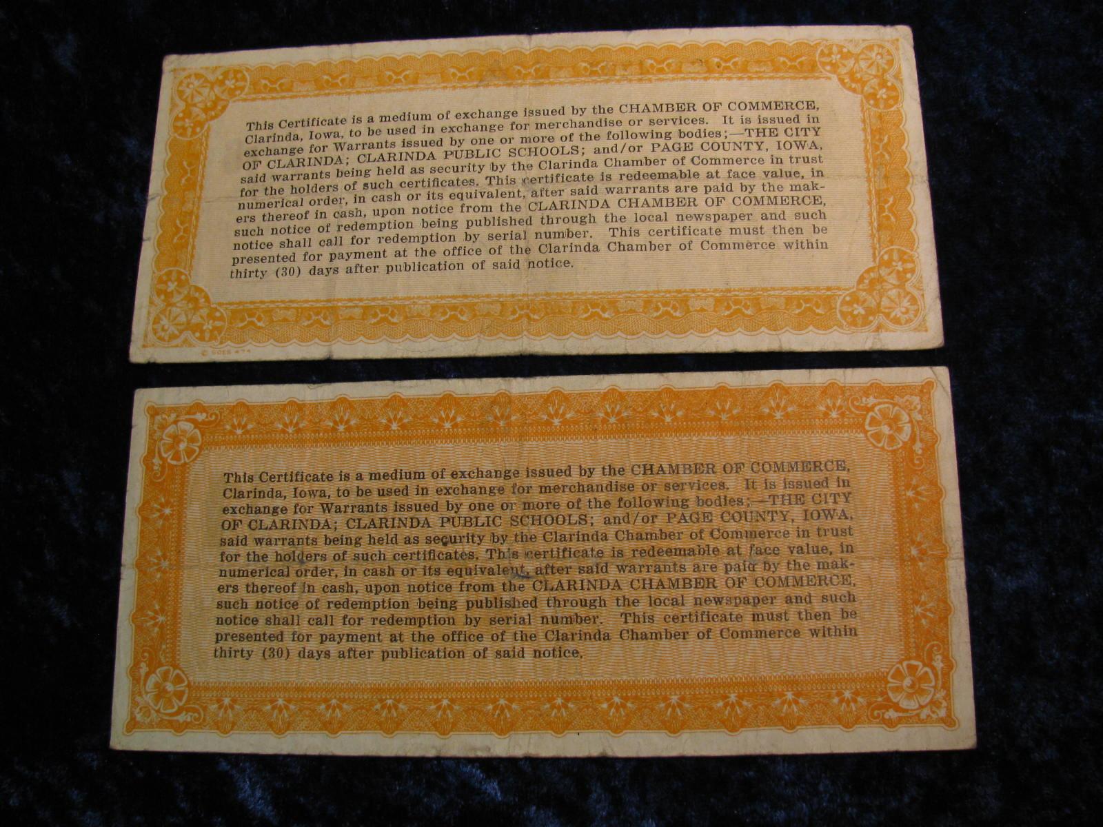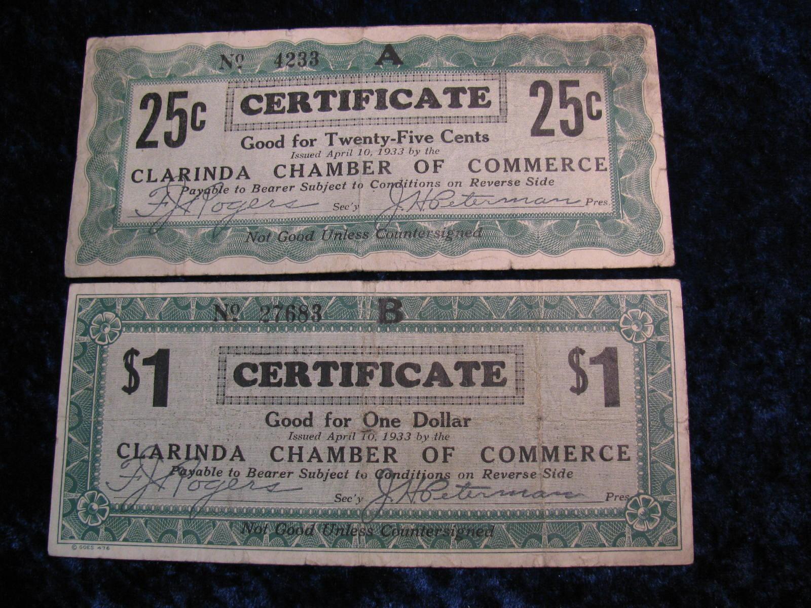 1915. 1933 Depression Script Clarinda, Iowa, 25c & $1.