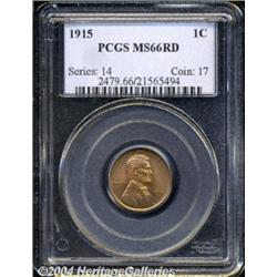 <B>1915<1C> MS66 Red PCGS.</B></I> This is a lovely P-mint Lincoln whose surfaces appear to be on fire with crimson-red luster. The strike is sharp and bold overall, and there is no visible carbon on either side. An amazingly preserved Gem quality example for the high grade specialist or type collector. Population: 71 in 66, 5 finer (6/04). <BR><BR><B>Important notice:</B> Heritage usually auctions material at the rate of 200-250 lots per hour. On some occasions eBay Live bid software or the Internet may not be able to keep up with the pace of the auction. We recommend placing a realistic absentee bid now as insurance to avoid disappointment. Occasionally the auctioneer may eliminate or reject an eBay Live bid, and the auctioneer may also reopen a lot after the close of the eBay live bidding (usually because we missed an audience bid), and may reject your bid even if it shows you as the winning bidder. By bidding via eBay Live, you agree that Heritage may award the lot to another bidder at its sole discretion under the circumstances described above or any other reasonable circumstances. Since eBay bids are not shown to us until we open the lot on the floor, we treat those bids just like floor bids. In most cases the floor responds before the eBay bid is presented to us, due to Internet lag time, so for consistency we have made it a policy that floor bids are always considered first over tie eBay live bids. Also please note that all Heritage lots purchased through eBay Live carry a 20% Buyer's Premium. Please make sure you read the Terms and Conditions before you bid. </span></font></tr></table></td></tr></table>