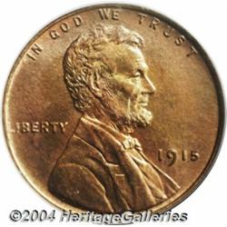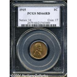 <B>1915<1C> MS66 Red PCGS.</B></I> The 1915 is one of the scarcer P-mint Lincolns from the teens to locate with full red color and in high grade. This piece has pronounced matte-like granularity and is fully struck. The surfaces display a variegated red coloration with light accents of lime green interspersed. Population: 71 in 66, 5 finer (3/04). <BR><BR><B>Important notice:</B> Heritage usually auctions material at the rate of 200-250 lots per hour. On some occasions eBay Live bid software or the Internet may not be able to keep up with the pace of the auction. We recommend placing a realistic absentee bid now as insurance to avoid disappointment. Occasionally the auctioneer may eliminate or reject an eBay Live bid, and the auctioneer may also reopen a lot after the close of the eBay live bidding (usually because we missed an audience bid), and may reject your bid even if it shows you as the winning bidder. By bidding via eBay Live, you agree that Heritage may award the lot to another bidder at its sole discretion under the circumstances described above or any other reasonable circumstances. Since eBay bids are not shown to us until we open the lot on the floor, we treat those bids just like floor bids. In most cases the floor responds before the eBay bid is presented to us, due to Internet lag time, so for consistency we have made it a policy that floor bids are always considered first over tie eBay live bids. Also please note that all Heritage lots purchased through eBay Live carry a 20% Buyer's Premium. Please make sure you read the Terms and Conditions before you bid. </span></font></tr></table></td></tr></table>