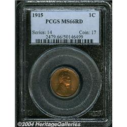 <B>1915<1C> MS66 Red PCGS.</B></I> An exceptionally well preserved example of this common early Lincoln cent. The surfaces have rich, original red color with a noticeable accent of pale-green around the margins. Sharply struck and problem-free, save for a couple of small carbon flecks on the reverse. Population: 66 in 66, 6 finer (8/04). <BR><BR><B>Important notice:</B> Heritage usually auctions material at the rate of 200-250 lots per hour. On some occasions eBay Live bid software or the Internet may not be able to keep up with the pace of the auction. We recommend placing a realistic absentee bid now as insurance to avoid disappointment. Occasionally the auctioneer may eliminate or reject an eBay Live bid, and the auctioneer may also reopen a lot after the close of the eBay live bidding (usually because we missed an audience bid), and may reject your bid even if it shows you as the winning bidder. By bidding via eBay Live, you agree that Heritage may award the lot to another bidder at its sole discretion under the circumstances described above or any other reasonable circumstances. Since eBay bids are not shown to us until we open the lot on the floor, we treat those bids just like floor bids. In most cases the floor responds before the eBay bid is presented to us, due to Internet lag time, so for consistency we have made it a policy that floor bids are always considered first over tie eBay live bids. Also please note that all Heritage lots purchased through eBay Live carry a 20% Buyer's Premium. Please make sure you read the Terms and Conditions before you bid.