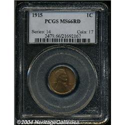 <B>1915<1C> MS66 Red PCGS.</B></I> Lustrous surfaces reveal orange patination with touches of faint olive-green. The design elements are adequately struck, and there are no mentionable abrasions or spots. A mild pebbly texture characterizes the reverse fields. Population: 70 in 66, 6 finer (9/04). <BR><BR><B>Important notice:</B> Heritage usually auctions material at the rate of 200-250 lots per hour. On some occasions eBay Live bid software or the Internet may not be able to keep up with the pace of the auction. We recommend placing a realistic absentee bid now as insurance to avoid disappointment. Occasionally the auctioneer may eliminate or reject an eBay Live bid, and the auctioneer may also reopen a lot after the close of the eBay live bidding (usually because we missed an audience bid), and may reject your bid even if it shows you as the winning bidder. By bidding via eBay Live, you agree that Heritage may award the lot to another bidder at its sole discretion under the circumstances described above or any other reasonable circumstances. Since eBay bids are not shown to us until we open the lot on the floor, we treat those bids just like floor bids. In most cases the floor responds before the eBay bid is presented to us, due to Internet lag time, so for consistency we have made it a policy that floor bids are always considered first over tie eBay live bids. Also please note that all Heritage lots purchased through eBay Live carry a 20% Buyer's Premium. Please make sure you read the Terms and Conditions before you bid.