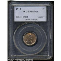 1915 1C PR65 Red PCGS. The production of Matte Pro <B>1915 1C PR65 Red PCGS.</B></I> The production of Matte Proof Lincolns was limited to just 1,150 pieces this year and percentage of Gem quality Red survivors is quite low. This remarkably struck specimen has just begun to mellow on Lincoln's portrait and the especially vibrant reverse has a splash of green-gold color across the center. Population: 17 in 65, 7 finer (10/04). <BR><BR><B>Important notice:</B> Heritage usually auctions material at the rate of 200-250 lots per hour. On some occasions eBay Live bid software or the Internet may not be able to keep up with the pace of the auction. We recommend placing a realistic absentee bid now as insurance to avoid disappointment. Occasionally the auctioneer may eliminate or reject an eBay Live bid, and the auctioneer may also reopen a lot after the close of the eBay live bidding (usually because we missed an audience bid), and may reject your bid even if it shows you as the winning bidder. By bidding via eBay Live, you agree that Heritage may award the lot to another bidder at its sole discretion under the circumstances described above or any other reasonable circumstances. Since eBay bids are not shown to us until we open the lot on the floor, we treat those bids just like floor bids. In most cases the floor responds before the eBay bid is presented to us, due to Internet lag time, so for consistency we have made it a policy that floor bids are always considered first over tie eBay live bids. Also please note that all Heritage lots purchased through eBay Live carry a 20% Buyer's Premium. Please make sure you read the Terms and Conditions before you bid. This lot is being auctioned in conjunction with a live floor auction by Heritage Galleries & Auctioneers. All final auction and invoice information will be supplied by Heritage Galleries & Auctioneers, and all other information should be considered preliminary. Lot:5409