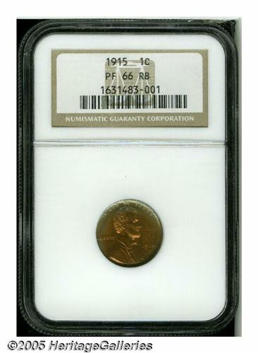 <B>1915<1C> PR66 Red and Brown NGC.</B></I> Silver-gray color at the borders forms a band across the pumpkin-orange centers. An exquisitely struck and seemingly pristine Gem. Matte proof issues are the unheralded keys to the Lincoln Cent series. Only 1,150 pieces were struck. NGC and PCGS combined have certified just 28 pieces at this grade level and color designation, with a mere one finer (5/05).