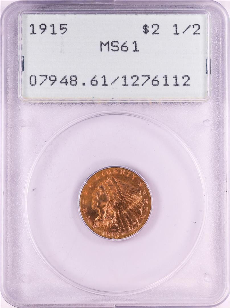 One 1915 $2 1/2 Indian Head Quarter Eagle Gold Coin PCGS MS61 Old Rattler Holder. PCGS Graded.