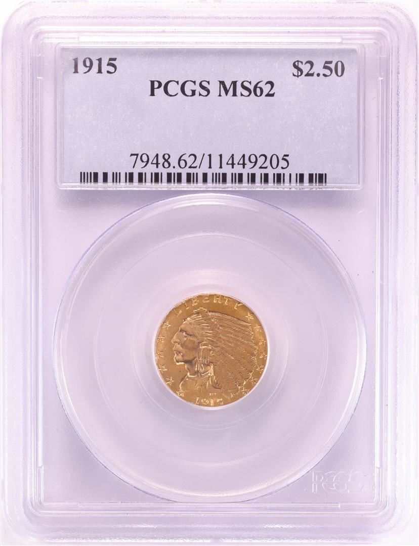 One 1915 $2 1/2 Indian Head Quarter Eagle Gold Coin PCGS MS62. PCGS Graded.