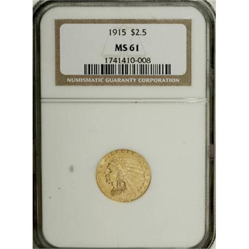 <B>1915 $2 1/2 MS61 NGC.</B></I> NGC Census: (1509/4614). PCGS Population (435/2489). Mintage: 606,000. Numismedia Wsl. Price for NGC/PCGS coin in MS61: $305. (#7948)<BR><BR><b>Shipping:</b> Coins & Currency (<a target="_blank" href="http://www.heritageauctions.com/common/shipping.php">view shipping information</a>)