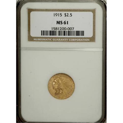 <B>1915 $2 1/2 MS61 NGC.</B></I> NGC Census: (1548/4717). PCGS Population (443/2679). Mintage: 606,000. Numismedia Wsl. Price for NGC/PCGS coin in MS61: $315. (#7948)<BR><BR><B>Coin Engraver:</B> Bela Lyon Pratt<BR><BR><b>Shipping:</b> Coins & Currency (<a target="_blank" href="http://www.heritageauctions.com/common/shipping.php">view shipping information</a>)