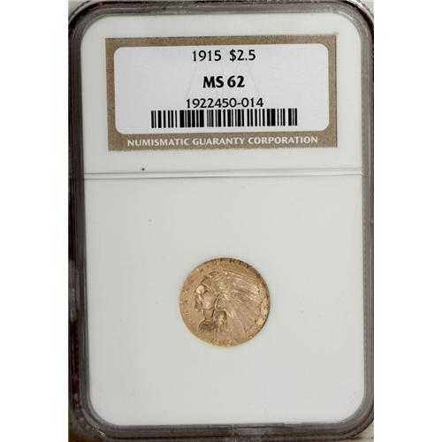 <B>1915 $2 1/2 MS62 NGC.</B></I> NGC Census: (2384/2161). PCGS Population (1072/1412). Mintage: 606,000. Numismedia Wsl. Price: $500. (#7948)<BR><BR><b>Shipping:</b> Coins & Currency (<a target="_blank" href="http://www.heritageauctions.com/common/shipping.php">view shipping information</a>)