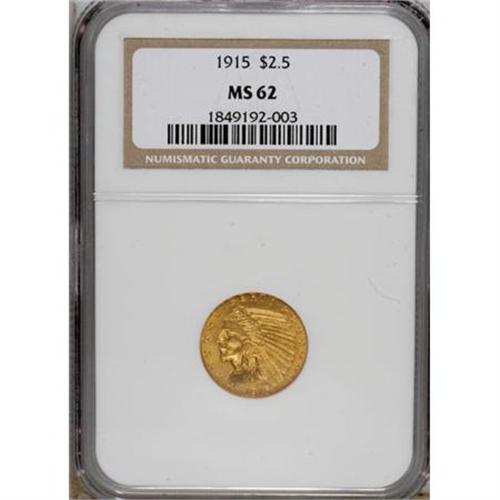 <B>1915 $2 1/2 MS62 NGC.</B></I> NGC Census: (2405/2209). PCGS Population (1086/1403). Mintage: 606,000. Numismedia Wsl. Price for NGC/PCGS coin in MS62: $480. (#7948)<BR><BR><b>Shipping:</b> Coins & Currency (<a target="_blank" href="http://www.heritageauctions.com/common/shipping.php">view shipping information</a>)