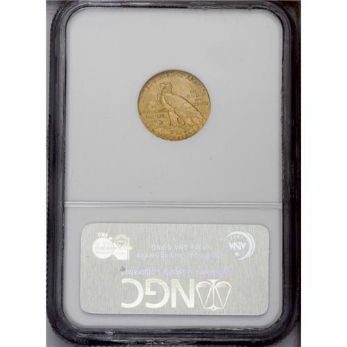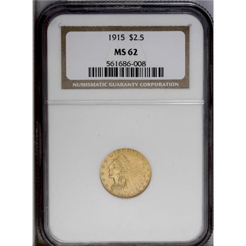 <B>1915<$2 1/2> MS62 NGC.</B></I> The subtly lustrous amber-mustard surfaces have small, scattered marks that partly account for the technical grade. Sharply struck with good eye appeal.