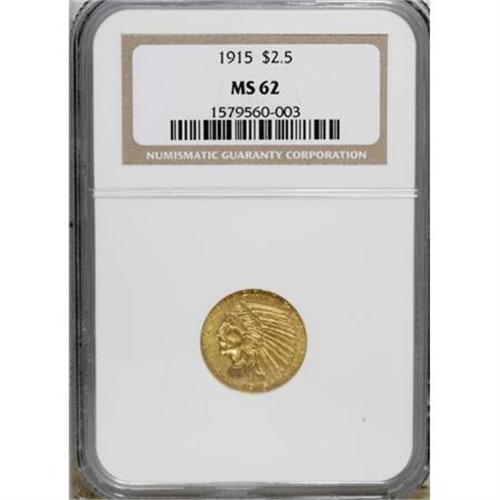 <B>1915 $2 1/2 MS62 NGC.</B></I> . NGC Census: (2568/2358). PCGS Population (1153/1588). Mintage: 606,000. Numismedia Wsl. Price for NGC/PCGS coin in MS62: $500. (#7948)<BR><BR><B>Coin Engraver:</B> Bela Lyon Pratt<BR><BR><b>Shipping:</b> Coins & Currency (<a target="_blank" href="http://www.heritageauctions.com/common/shipping.php">view shipping information</a>)