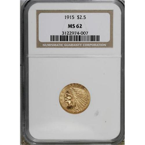 <B>1915 $2 1/2 MS62 NGC.</B></I> . NGC Census: (2571/2359). PCGS Population (1166/1606). Mintage: 606,000. Numismedia Wsl. Price for NGC/PCGS coin in MS62: $500. (#7948)<BR><BR><B>Coin Engraver:</B> Bela Lyon Pratt<BR><BR><b>Shipping:</b> Coins & Currency (<a target="_blank" href="http://www.heritageauctions.com/common/shipping.php">view shipping information</a>)