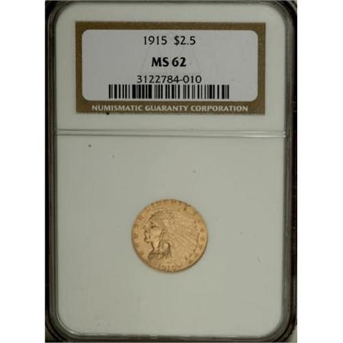<B>1915 $2 1/2 MS62 NGC.</B></I> NGC Census: (2599/2381). PCGS Population (1182/1635). Mintage: 606,000. Numismedia Wsl. Price for NGC/PCGS coin in MS62: $500. (#7948)<BR><BR><B>Coin Engraver:</B> Bela Lyon Pratt<BR><BR><b>Shipping:</b> Coins & Currency (<a target="_blank" href="http://www.heritageauctions.com/common/shipping.php">view shipping information</a>)