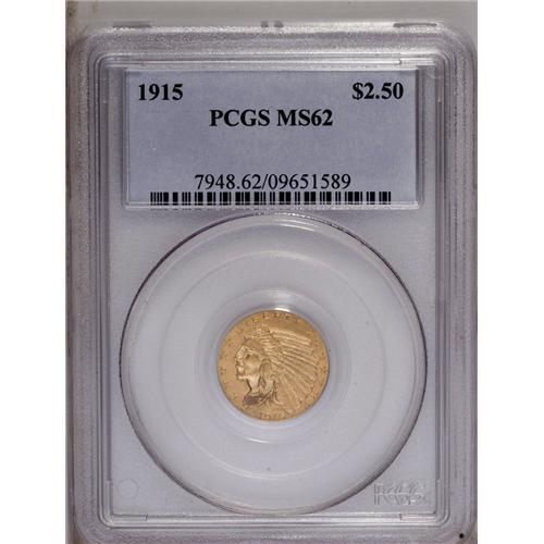 <B>1915<$2 1/2> MS62 PCGS.</B></I> A bold striking with subtle pumpkin-orange and lilac highlights. <BR><BR><B>Important notice:</B> Heritage usually auctions material at the rate of 200-250 lots per hour. On some occasions eBay Live bid software or the Internet may not be able to keep up with the pace of the auction. We recommend placing a realistic absentee bid now as insurance to avoid disappointment. Occasionally the auctioneer may eliminate or reject an eBay Live bid, and the auctioneer may also reopen a lot after the close of the eBay live bidding (usually because we missed an audience bid), and may reject your bid even if it shows you as the winning bidder. By bidding via eBay Live, you agree that Heritage may award the lot to another bidder at its sole discretion under the circumstances described above or any other reasonable circumstances. Since eBay bids are not shown to us until we open the lot on the floor, we treat those bids just like floor bids. In most cases the floor responds before the eBay bid is presented to us, due to Internet lag time, so for consistency we have made it a policy that floor bids are always considered first over tie eBay live bids. Also please note that all Heritage lots purchased through eBay Live carry a 20% Buyer's Premium. Please make sure you read the Terms and Conditions before you bid. This lot is being auctioned in conjunction with a live floor auction by Heritage Galleries & Auctioneers. All final auction and invoice information will be supplied by Heritage Galleries & Auctioneers, and all other information should be considered preliminary. Lot:2511 <BR><BR><B>Winning Notification and Billing:</B> After the FINAL session in this auction is complete, Heritage will send e-mail and snail mail invoices. This process normally takes several days. All final auction and invoice information will be supplied by Heritage Galleries & Auctioneers, and all other information should be considered preliminary. <BR><BR>This auction will be conducted on a live auction floor and over the Internet through eBay Live. If you choose to place an absentee bid, please take a moment to <font color='#0000ff'><u><a href='http://pages.ebay.com/liveauctions/help/before/laabsentee.html'>learn how eBay Live absentee bidding works</a></u></font><font color='#000000'>