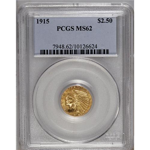 <B>1915<$2 1/2> MS62 PCGS.</B></I> Lemon-yellow with tinges of green. A lustrous piece that has few marks for the grade, though the strike is somewhat weak on the bonnet.