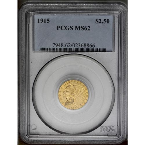 1915 $2 1/2 MS62 PCGS. Rich apricot-gold patina bathes 1915[$2 1/2] MS62 PCGS.