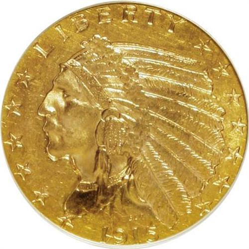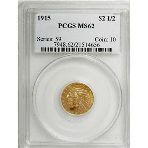 <B>1915 $2 1/2 MS62 PCGS.</B></I> PCGS Population (1141/1562). NGC Census: (2539/2328). Mintage: 606,000. Numismedia Wsl. Price for NGC/PCGS coin in MS62: $500. (#7948)<BR><BR><B>Coin Engraver:</B> Bela Lyon Pratt<BR><BR><b>Shipping:</b> Coins & Currency (<a target="_blank" href="http://www.heritageauctions.com/common/shipping.php">view shipping information</a>)