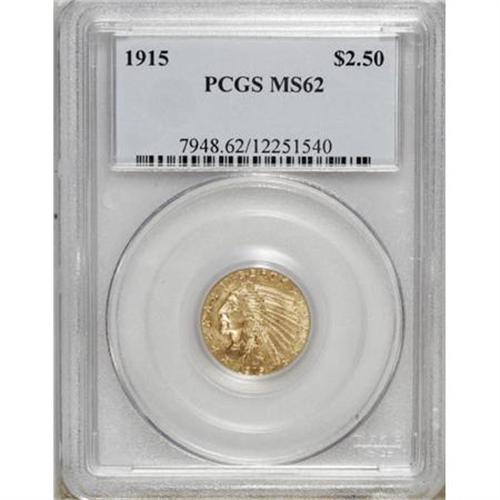 <B>1915 $2 1/2 MS62 PCGS.</B></I> . PCGS Population (1153/1588). NGC Census: (2570/2360). Mintage: 606,000. Numismedia Wsl. Price for NGC/PCGS coin in MS62: $500. (#7948)<BR><BR><B>Coin Engraver:</B> Bela Lyon Pratt<BR><BR><b>Shipping:</b> Coins & Currency (<a target="_blank" href="http://www.heritageauctions.com/common/shipping.php">view shipping information</a>)