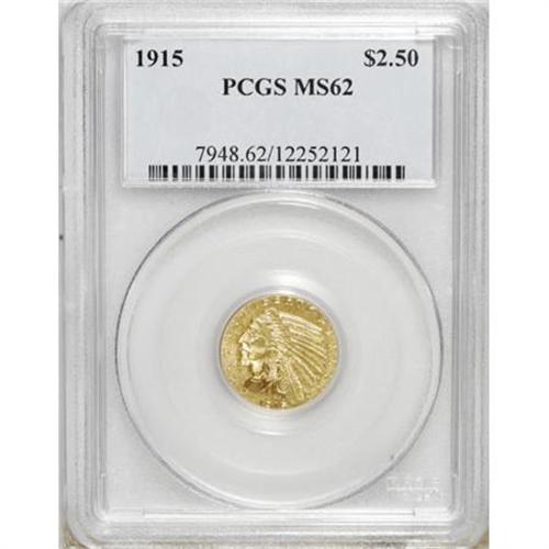 <B>1915 $2 1/2 MS62 PCGS.</B></I> . PCGS Population (1153/1588). NGC Census: (2570/2360). Mintage: 606,000. Numismedia Wsl. Price for NGC/PCGS coin in MS62: $500. (#7948)<BR><BR><B>Coin Engraver:</B> Bela Lyon Pratt<BR><BR><b>Shipping:</b> Coins & Currency (<a target="_blank" href="http://www.heritageauctions.com/common/shipping.php">view shipping information</a>)