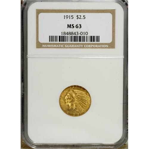 <B>1915 $2 1/2 MS63 NGC.</B></I> A lustrous, yellow-gold quarter eagle with sharply impressed design features. Light handling marks are noted in the reverse fields.<BR><BR><b>Shipping:</b> Coins & Currency (<a target="_blank" href="http://www.heritageauctions.com/common/shipping.php">view shipping information</a>)