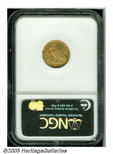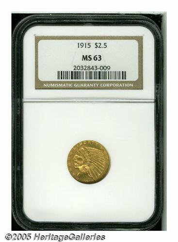 <B>1915<$2 1/2> MS63 NGC.</B></I> Honey-gold surfaces are imbued with traces of reddish color, and exhibit soft luster. The design elements are adequately struck, though the eagle's left shoulder is a touch soft. A couple of minor contact marks are located on the Indian's cheek and in the upper reverse field.<BR><I>From the Dr. Kurt Peters Collection.</B></I> From the Dr. Kurt Peters Collection.