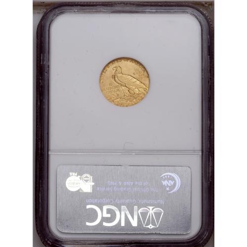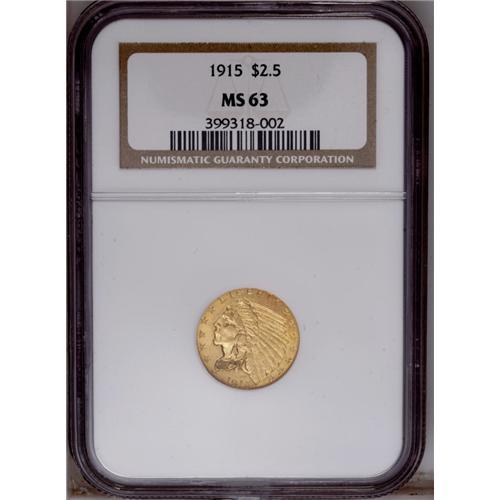 <B>1915<$2 1/2> MS63 NGC.</B></I> Honey-gold surfaces are imbued with traces of reddish color, and exhibit soft luster. The design elements are adequately struck, though the eagle's left shoulder is a touch soft. A couple of minor contact marks are located on the reverse field.