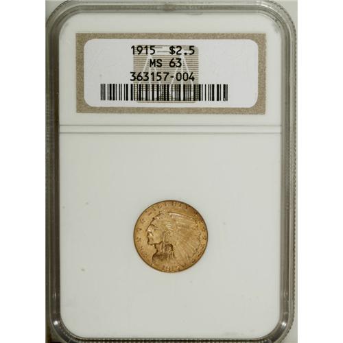 <B>1915 $2 1/2 MS63 NGC.</B></I> Nicely struck with above-average luster and minor, scattered abrasions. The fields are predominantly yellow-gold, though traces of orange appear as well.<BR><BR><b>Shipping:</b> Coin/Currency (<a target="_blank" href="http://www.heritageauctions.com/common/shipping.php">view shipping information</a>)