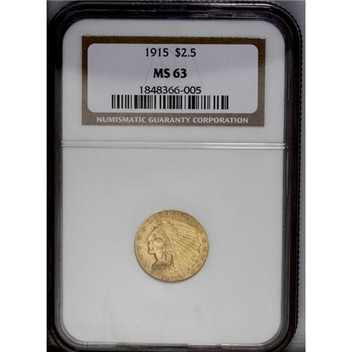 <B>1915<$2 1/2> MS63 NGC.</B></I> Select and nicely struck with lustrous yellow-green surfaces that have hints of orange. Small, scattered marks are noted on each side.