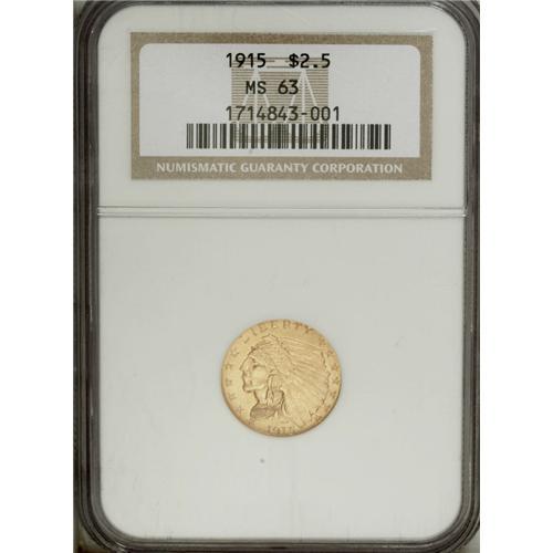 <B>1915 $2 1/2 MS63 NGC.</B></I> The glowing yellow-orange fields display only minor marks. Overall, the devices have suitable definition, though the necklace shows some softness.<BR><BR><b>Shipping:</b> Coin/Currency (<a target="_blank" href="http://www.heritageauctions.com/common/shipping.php">view shipping information</a>)