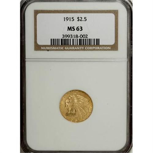 <B>1915 $2 1/2 MS63 NGC.</B></I> NGC Census: (1259/994). PCGS Population (781/693). Mintage: 606,000. Numismedia Wsl. Price for NGC/PCGS coin in MS63: $1,040. (#7948)<BR><BR><B>Coin Engraver:</B> Bela Lyon Pratt<BR><BR><b>Shipping:</b> Coins & Currency (<a target="_blank" href="http://www.heritageauctions.com/common/shipping.php">view shipping information</a>)