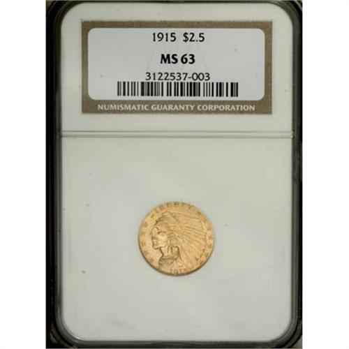 <B>1915 $2 1/2 MS63 NGC.</B></I> NGC Census: (1273/1007). PCGS Population (800/752). Mintage: 606,000. Numismedia Wsl. Price for NGC/PCGS coin in MS63: $1,040. (#7948)<BR><BR><B>Coin Engraver:</B> Bela Lyon Pratt<BR><BR><b>Shipping:</b> Coins & Currency (<a target="_blank" href="http://www.heritageauctions.com/common/shipping.php">view shipping information</a>)