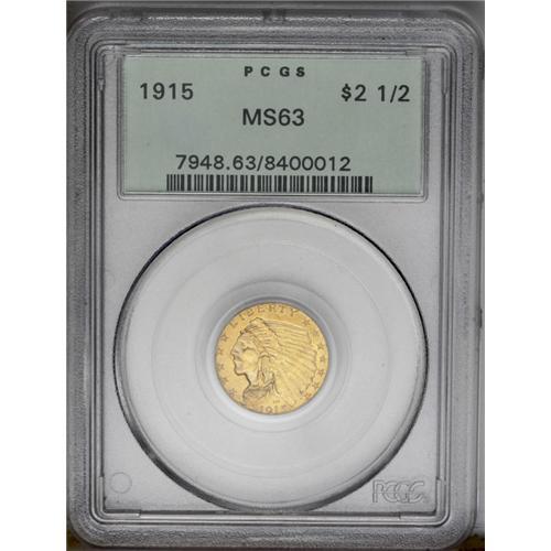 <B>1915<$2 1/2> MS63 PCGS.</B></I> A shimmering example that displays deep khaki-gold toning. Crisply struck for the type, and light reverse marks are of little interest. Encased in a green label holder.