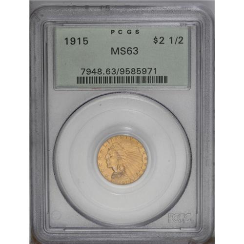 <B>1915 $2 1/2 MS63 PCGS.</B></I> Deep orange toning embraces this assertively struck and thoroughly lustrous type coin. A couple of faint handling marks near the 191 in the date are of little import. Certified in a green label holder.