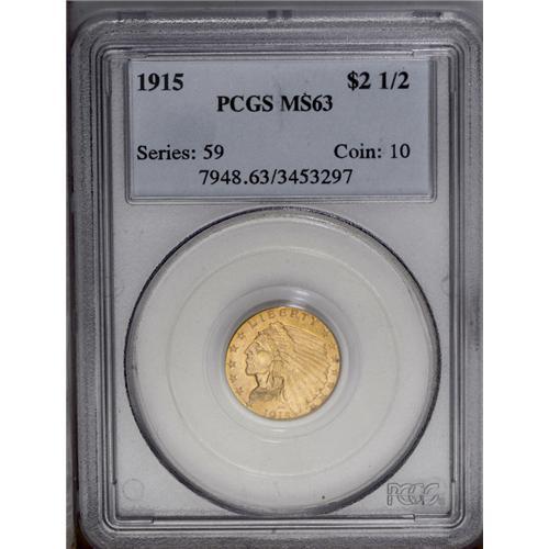 <B>1915 $2 1/2 MS63 PCGS.</B></I> Frosty and lustrous with deep pinkish-gold color and exceptional eye appeal. This is an example of amazing quality for the grade.