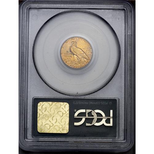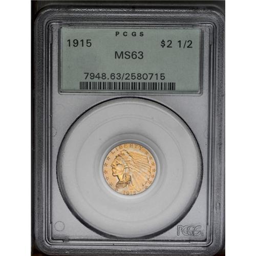 <B>1915<$2 1/2> MS63 PCGS.</B></I> Rich orange and powder-blue enrich this satiny quarter eagle, which has a thin horizontal mark on the cheek but is otherwise attractive. Certified in a green label holder.