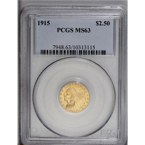 <B>1915<$2 1/2> MS63 PCGS.</B></I> Select and lustrous with green-gold highlights on the amber surfaces. Nicely detailed with some scattered marks over both sides.