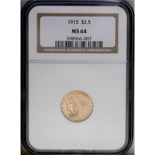 <B>1915 $2 1/2 MS64 NGC.</B></I> A frosty and lustrous example with hints of pinkish color over lovely yellow-gold surfaces. This is a plentiful issue, from the fourth highest mintage of the entire series, however, it is not considered to be a common date.