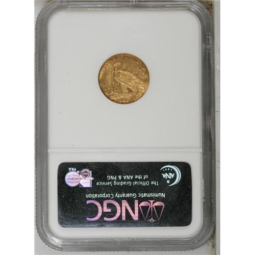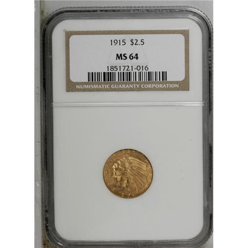 <B>1915 $2 1/2 MS64 NGC.</B></I> A satiny orange-gold near-Gem that sports traces of red above the bonnet. The surfaces are clean for the grade, though the necklace displays some weakness.<BR><BR><b>Shipping:</b> Coin/Currency (<a target="_blank" href="http://www.heritageauctions.com/common/shipping.php">view shipping information</a>)