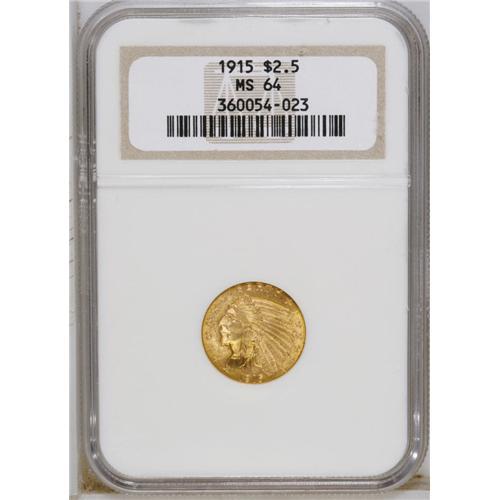 <B>1915 $2 1/2 MS64 NGC.</B></I> Attractive peach-gold patina adorns both sides of this lovely near-Gem. Sharply impressed throughout, with no significant marks to report.<BR><BR><b>Shipping:</b> Coin/Currency (<a target="_blank" href="http://www.heritageauctions.com/common/shipping.php">view shipping information</a>)