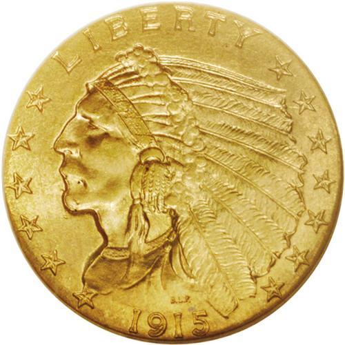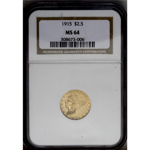 <B>1915<$2 1/2> MS64 NGC.</B></I> Honey-gold surfaces include a few subtle touches of pale green and tan colors, and reveal nicely struck design elements. A few small marks in the lower left reverse field limit the grade.